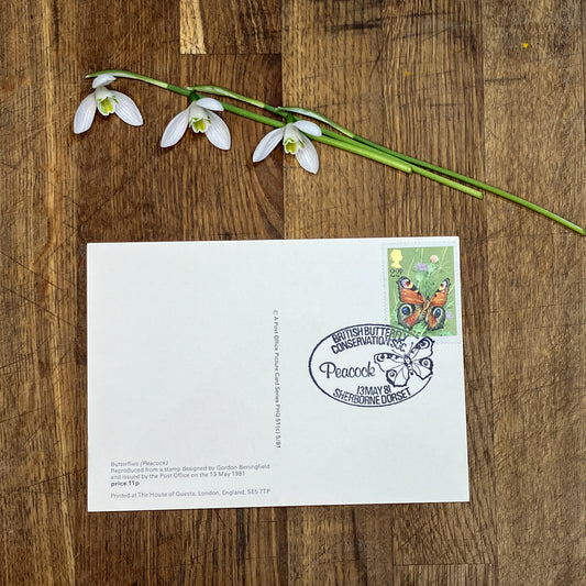 Butterfly vintage postcard with first day issue stamps | Peacock butterfly | Butterflies by Gordon Beningfield | 22p stamp 1981