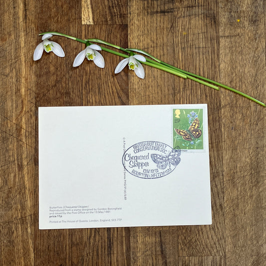Butterfly vintage postcard with first day issue stamps | Chequered Skipper butterfly | Butterflies by Gordon Beningfield | 25p stamp 1981