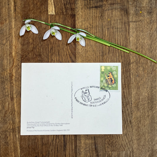 Butterfly vintage postcard with first day issue stamps | Small Tortoiseshell butterfly | Butterflies by Gordon Beningfield | 14p stamp 1981