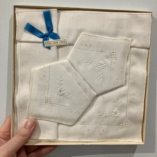 Linen lace handkerchiefs ~ vintage in box with genuine age spots