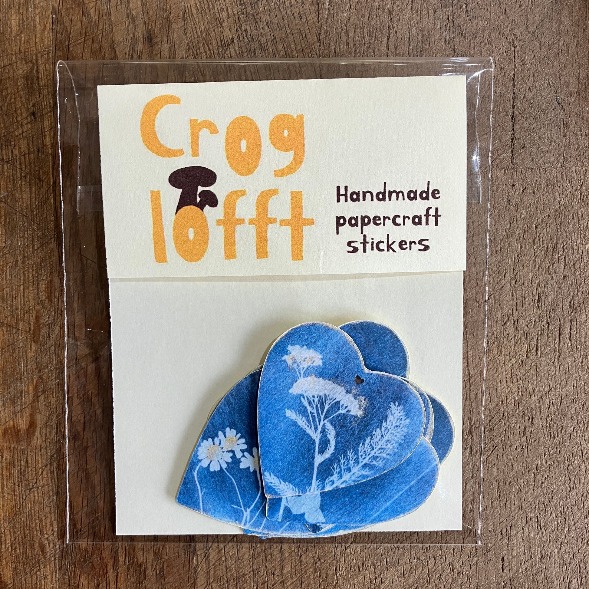 These botanical heart sticker designs have been made using my original cyanotype wooden botanical heart decorations. The stickers are in a variety of blues, with hints of gold edging, and show the texture of the wood grain from the original decorations.