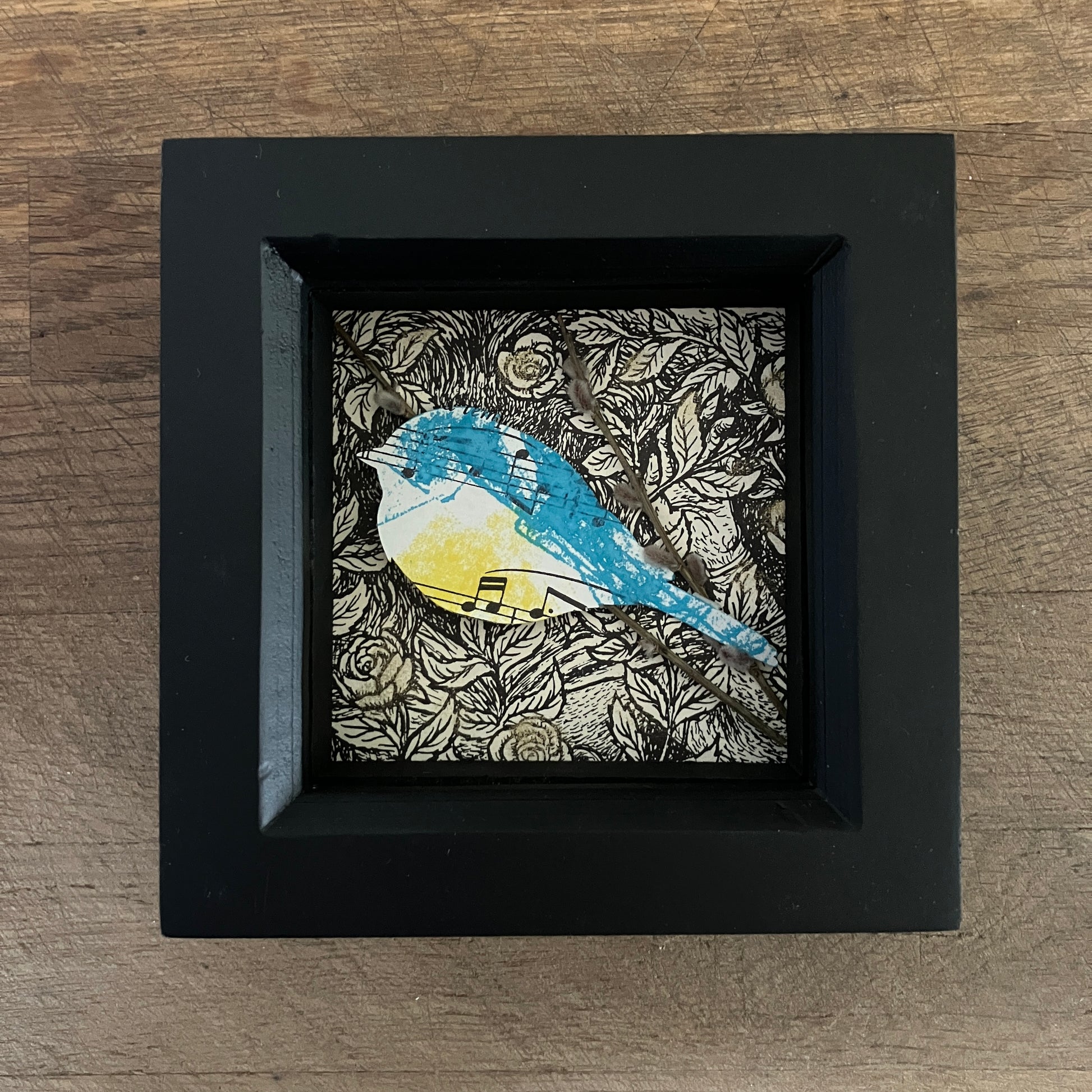 The framed artwork measures 11.5cm x 11.5cm and sits in a deep frame that will free stand or can be hung. 'Singing the blues' can be purchased as an individual piece or as part of a pair with 'Hedgerow Wren'.