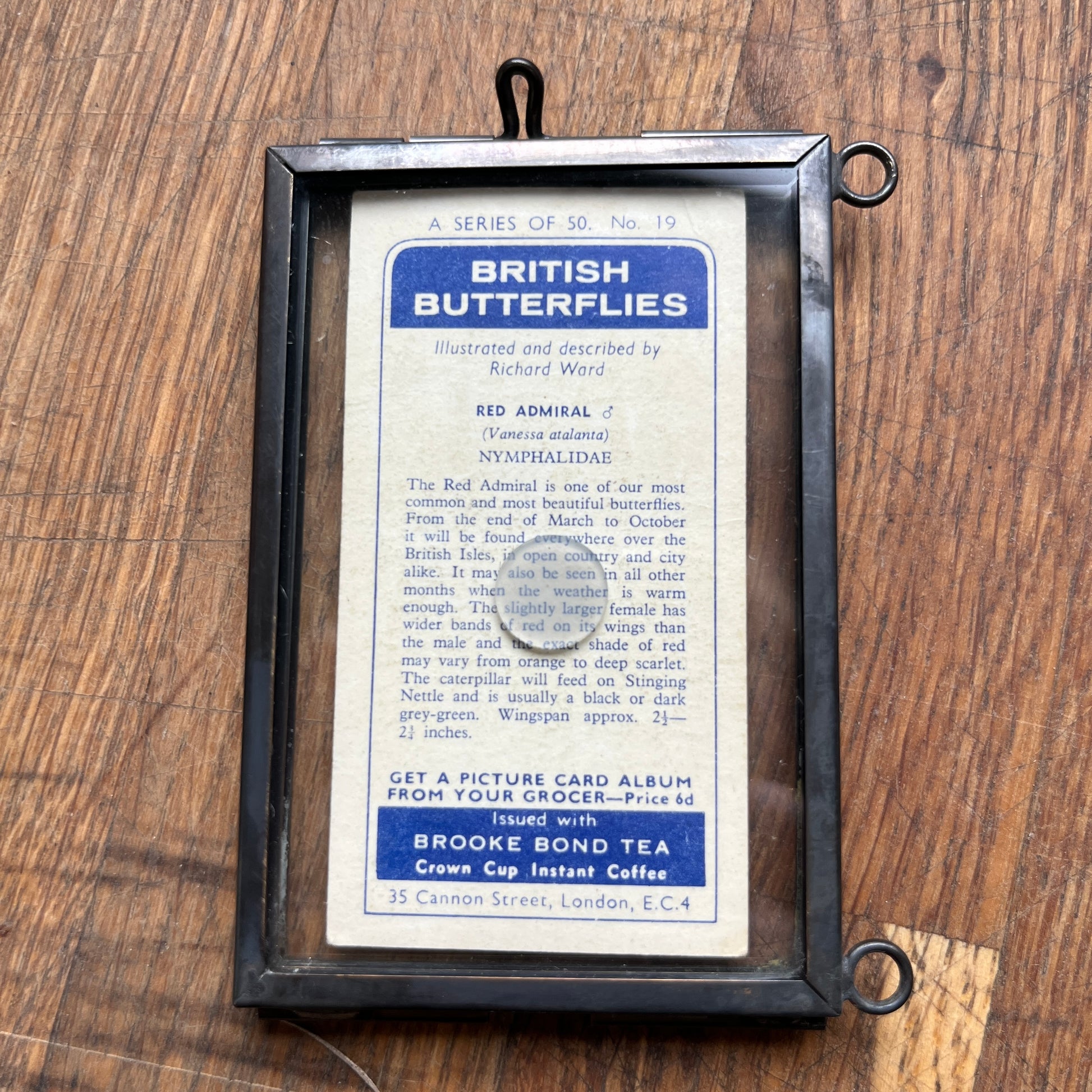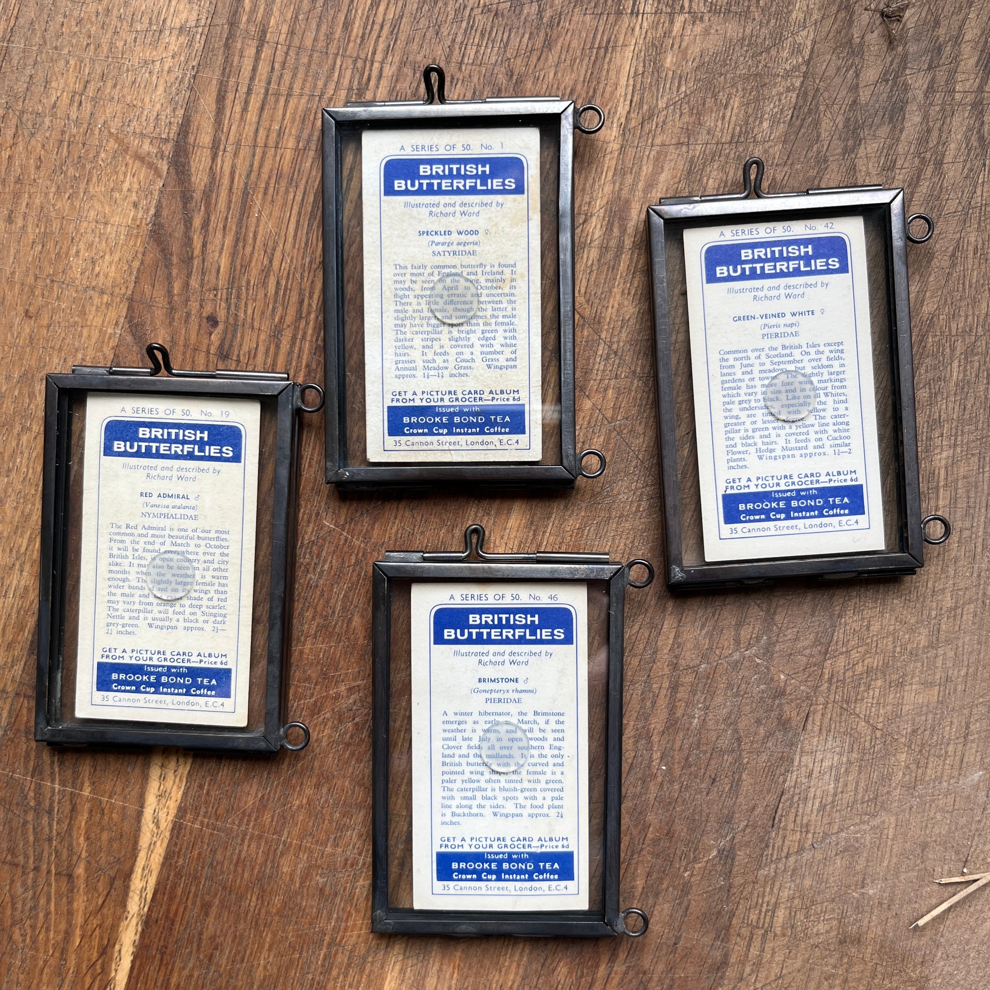 The illustrated butterflies are Speckled Wood, Red Admiral, Green Veined White and Brimstone, all species native to the British Isles. Each tea card has a description of the butterfly on the reverse, which can be seen through the metal edged double sided glass frame.